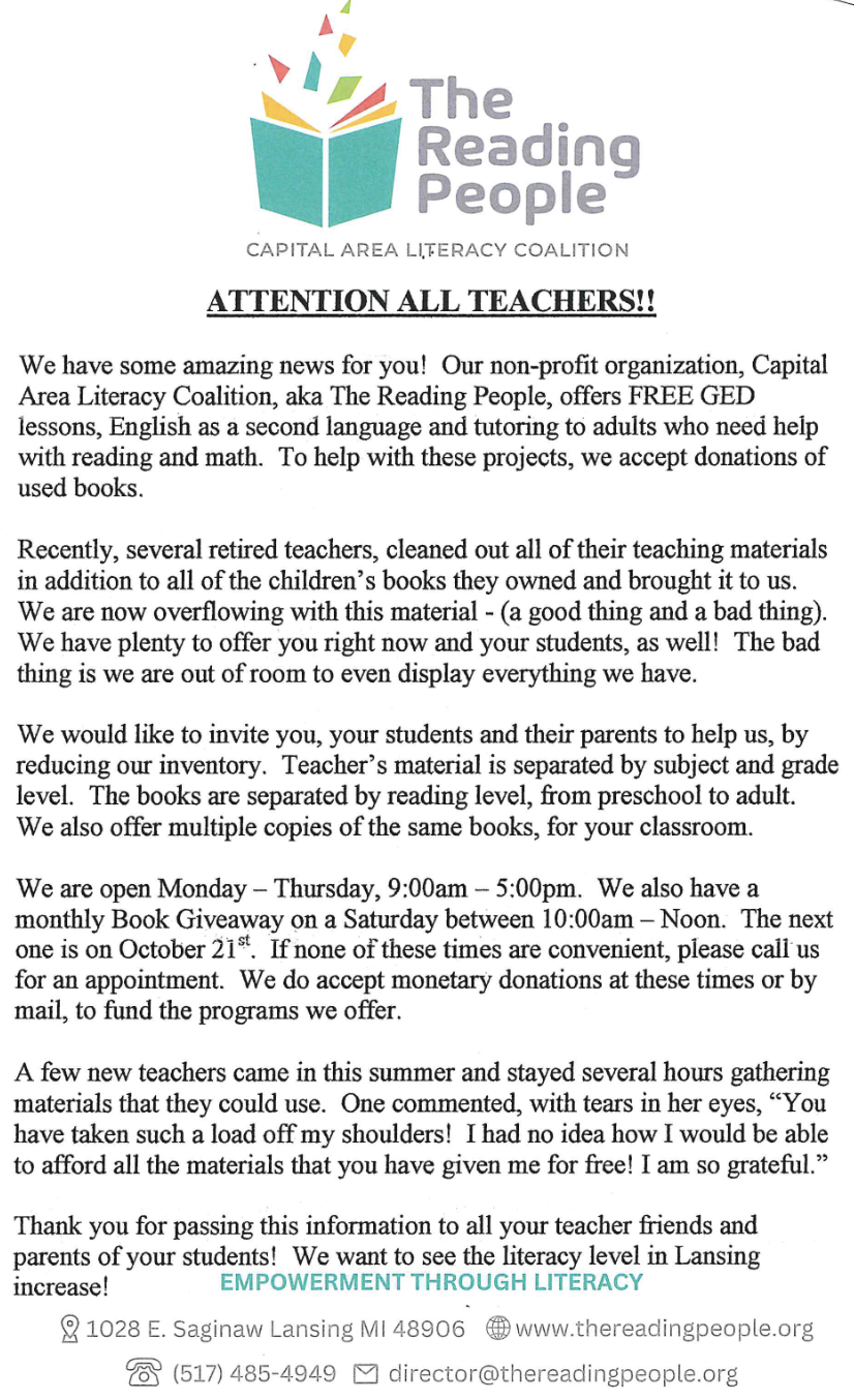 The Grand Ledge Emergency Assistance Program (GLEAP) is currently taking applications for its annual Christmas Food Basket program for families who live in the Grand Ledge School District. Donors in the community (individuals & groups) have volunteered to provide a food basket during the Christmas season for families in need. If this would be helpful for your family, please submit an application by October 28 – pick up a paper application in the school's main office or complete an online application at GLcomets.net/ChristmasFoodBasket. You will be contacted by a donor sometime early in December. This will be done on a first-come, first-serve basis.